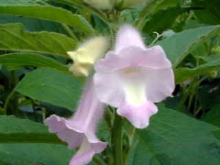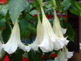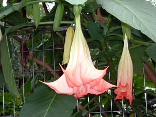 | 夏の花の代名詞、といえば「朝顔」ですが、同じ朝顔でもこのアサガオはちょっと想像できません。 花の大きさが30cmもあり、その上下を向いていて、まるで蝙蝠がとまっているよう。 英文名のDutura(ダチュラ)はインドの町の名前から来たものです。 朝鮮朝顔(チョウセンアサガオ) |