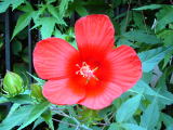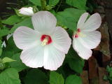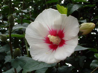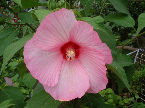 芙蓉(フヨウ) 立葵(タチアオイ)とよく似た花ですが、大振りで、「アメリカ芙蓉」とも呼ばれます。花の名に「アメリカ・・・」がつくとだいたい大振りです。色はピンクや白、赤があります。 (世田谷区大原) |