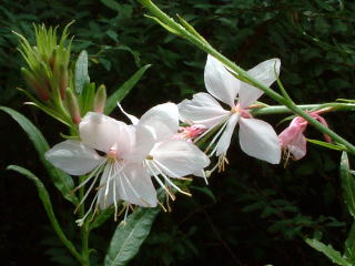 | 白蝶草(ハクチョウソウ) 風に吹かれると、 ふわふわ飛ぶ白蝶のよう。 別名、山桃草(ヤマモモソウ) ピンクもありますが、白でないと・・・・ ガウラが正式な名前です。 (世田谷区代田) |