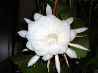 | 月下美人(ゲッカビジン) サボテンの1種。1年で1度しか開花せず、それも夜10時頃から3時間ほどで、すぐ萎んでしまいます。 オフィスからの帰り道にたまたま出会いました。翌日よく見ようと行ったら、花は全部刈られていました。 実に、一期一会です。 一字違いの「月下氷人」は仲人のこと。 2003年7月 (世田谷区祖師谷) |