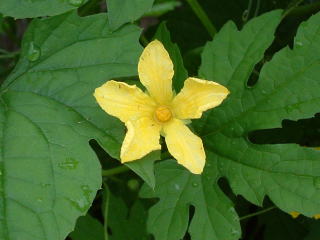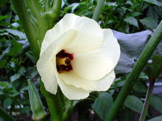 | 夏バテ解消には「粘りけ」や「苦み」のある野菜がいいといいます。 野菜畑も協力を惜しみません。さて、今日のお昼は、オクラとゴーヤをゴマ油で炒めた「チャンプル」にしよう。 (ビタミンC がたっぷりで、二日酔いにも効き目があります) |