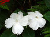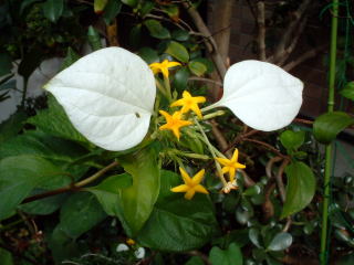| 崑崙花(コンロンカ) 白い葉を、万年雪を頂く崑崙山に見立てました。 崑崙山には1000年に1度咲く桃花を守る西王母が 住んでいると伝えられています。 (世田谷区羽根木) |
