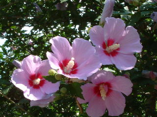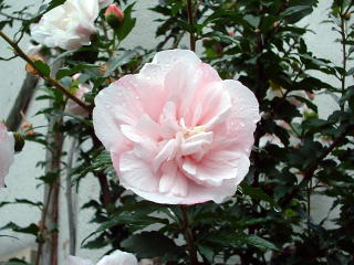 木槿(ムクゲ) 芙蓉と似た花の形や色合いですが、木槿は木です。(芙蓉は多年草) 「槿花一朝の夢」(能「敦盛」)と儚いことの譬えによく使われますが、個々の花弁は一日で萎むものの、木全体としては一夏を通じて楽しませてくれます。 韓国の国花「永遠に枯れることなく咲き続ける花」からきています。チマチョゴリの優美さも感じます。 花の色は薄紫が多く、白もあります。八重の木槿もありますよ。 (世田谷区桜上水) |