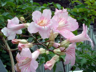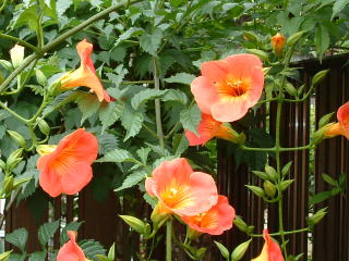 凌霄花 (ノウゼンカズラ) この花が咲くと「今年も夏が来た」と感じます。 ←(世田谷区赤堤) ピンクもあります 砧→ |