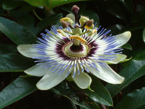 時計草(トケイソウ) 花弁が文字盤で、雄蕊と雌蕊が針の様。レーダーのようにも見えますね。 英語ではPassionflower。実は食用なのですが、見たことはありません。沖縄での栽培が多いとか。 (世田谷区松原) |