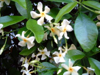 定家葛(テイカカズラ) ジャスミンのような甘い香りがします。能の「定家」に由来。藤原定家(新古今和歌集の選者)の式子内親王に対する恋の思いが、死後、彼女の墓にまとわりついたいう話から。恐いですね・・・、それともそこまで思われるのは女性にとって至福でしょうか。 (世田谷区羽根木) |