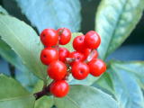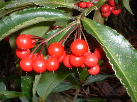 万両(マンリョウ) クリスマスの飾りの柊(ヒイラギ)と赤い実のように、常緑の葉は「活力」の象徴。 正月の門松や松飾りも同じ願いを込めています。 万両も常緑の葉と赤い実を持ち、盆栽で正月の床の間に飾られます。 この万両は、正月を実家で過ごしたとき撮ったもので、父の作品です。 同じような名で「千両」がありますが、種類は違います。 (渋谷区上原)正月に、この万両と千両、そして蟻通しを一緒に並べて飾ります。これは「万両、千両、(いつも)有り通し」にかけた祝い事。 万両は葉の下に実が付きます。反対に千両は葉の上に付き、鳥に食べられやすく、長持ちしないため10分の1の価値になってしましました。この他に、百両、十両、一両(蟻通し)があります。 |