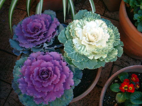 | 葉牡丹(ハボタン) (世田谷区松原) 牡丹の名が付いていますが、実は「キャベツ」の仲間。春になると黄色い菜の花に似た花が咲きます。 お節料理を食べ過ぎてお腹が重くなった方はキャベツの千切りサラダが消化を助けます。 (もっともハボタンは食べられませんが・・・) 牡丹の花はここをクリック。 |