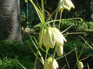 貝母(バイモ) 別名:網笠百合 花弁に薄紫色の網がかかったような模様があります。 (世田谷区祖師谷) |