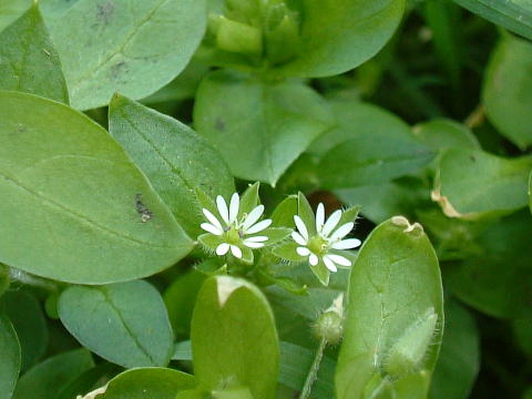 萋(ハコベ) 子供の頃野鳥の鶸(ヒワ)を飼っていて(今なら犯罪ですが・・・)、その餌として葉をすりつぶして与えていました。別名ヒヨコ草ともいっていました。 (港区六本木) |
