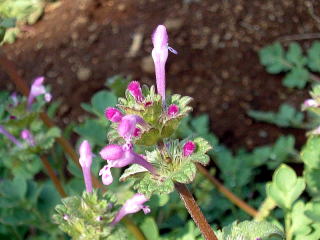 | 薺(ナズナ) 実が三味線の撥に似ていることから別名ペンペン草 (世田谷区赤堤) | 仏の座(ホトケノザ) 今はタビラコが七草です。 (世田谷区赤堤) |
