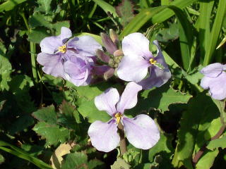 紫花菜(ムラサキハナナ) オオアラセイトウとも、花大根とも呼ばれます。 アラセイトウはストックのこと。 鉄道沿線の日当たりのよい土手でよく見られます。 御茶ノ水駅の対岸に群落があり、紫の絨毯を一面に敷いたようです。 (世田谷区砧) |