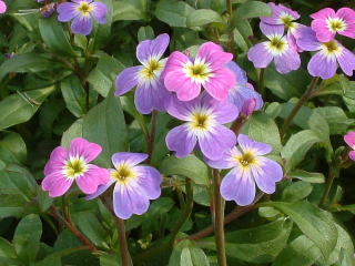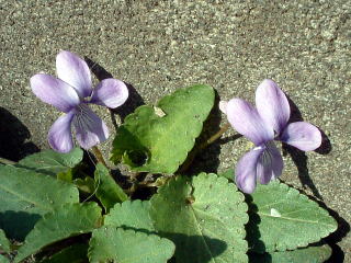 菫(スミレ) 菫というと・・・宝塚! ♪ら〜ら〜ら、赤い花束、車に積んで・・・ 春が来た来た、村から町へ・・・ 菫買いましょ、あの花売りの、黒い瞳に春の夢♪ この菫は花園でなく、コンクリートの道ばたにシッカリト根を付けています。 踏まれても、踏まれても・・・・ (世田谷区砧) |
