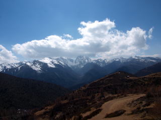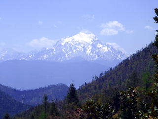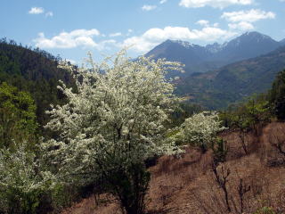 | 天宝雪山 (標高4580m) 手前の花は野梨 (香格里拉県九龍村から) |