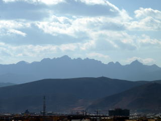 | 石卡(シーカー)雪山(標高4420m) 香格里拉の市街地のすぐ近くにあり、ロープウェで頂上まで上がることができます。 |